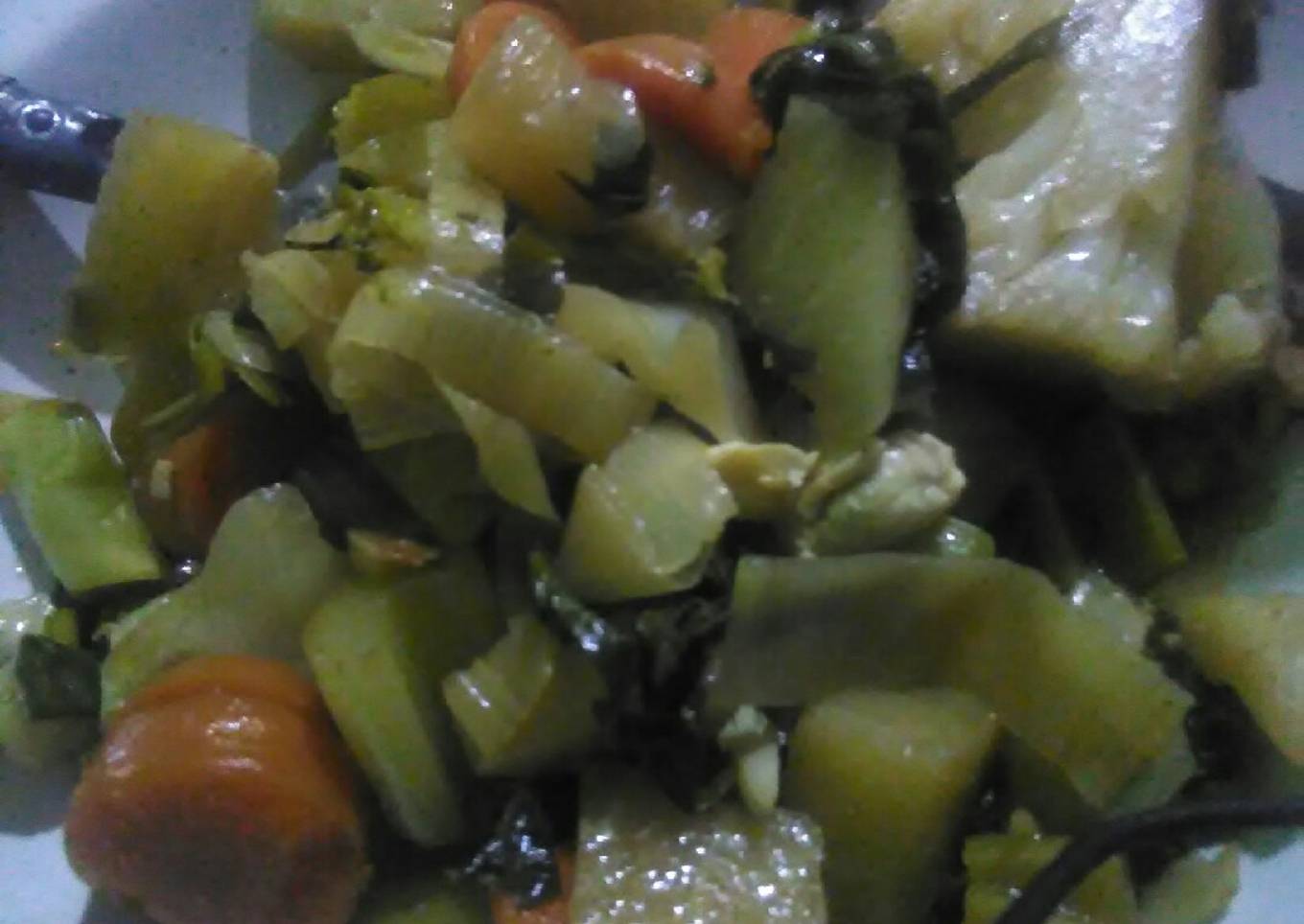 - Después del tiempo dicho se agregan las verduras y el jengibre restantes con lo sobrante de la salsa de soya se revuelve y se tapa se me espera de 5 a 10 minutos.