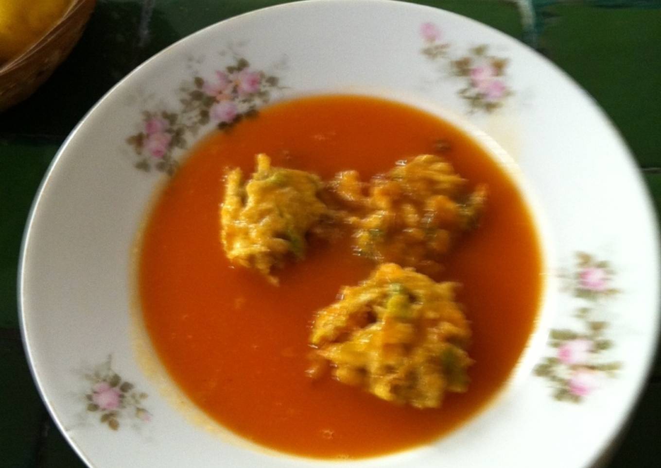 - Ya para servir la sopa se ponen las tortitas unos minutos y se sirven 3 en cada plato con suficiente caldo.