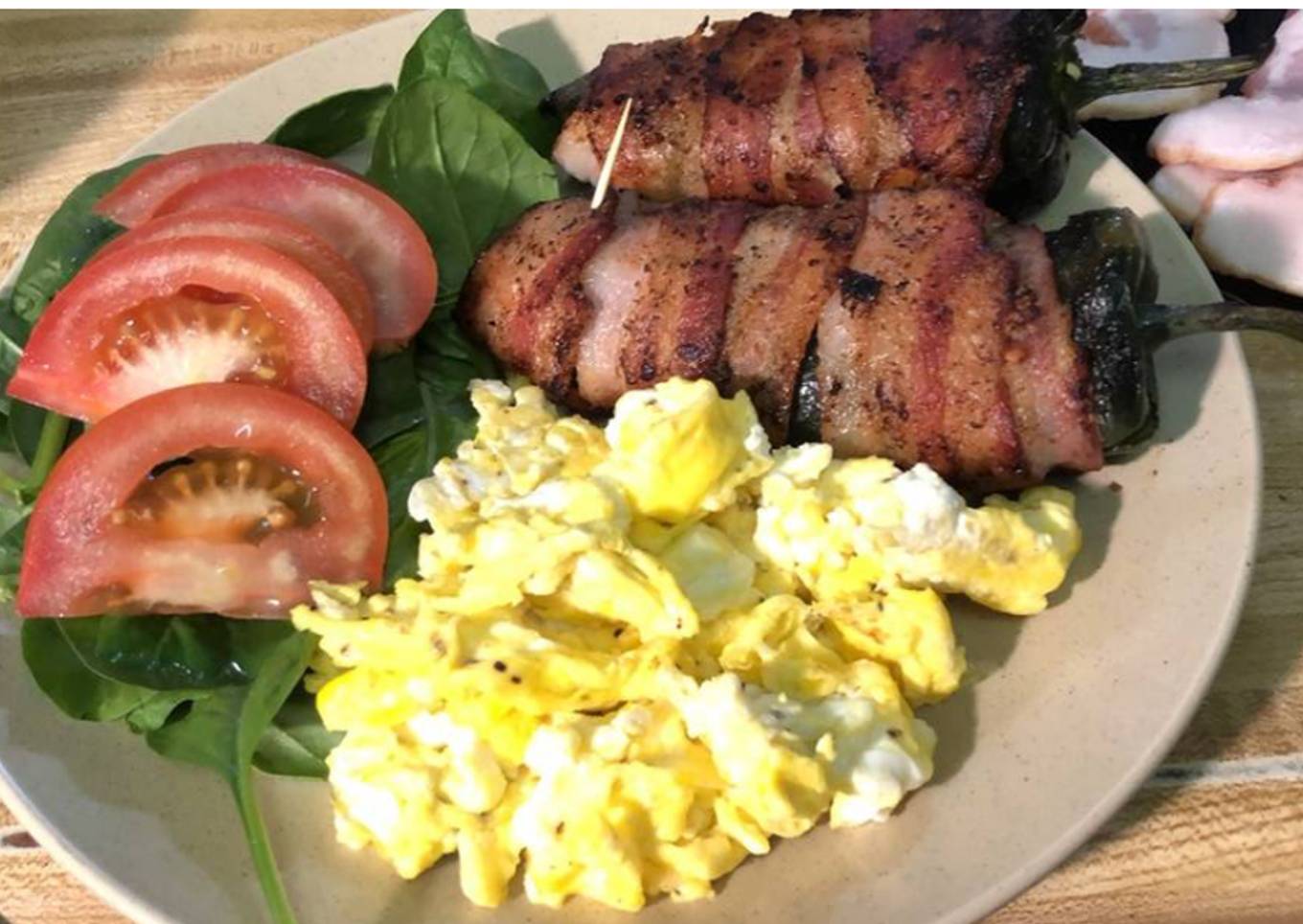 Este es un rico desayuno, que preparé en especial a mi marido. Aunque cocinar me apasiona, la inspiración me viene más, cuando tengo al ser que amo a mi lado. Y pues siempre trato de agazajarlo, haciendo comidas que sé... que son sus favoritas y muchas otras... para sorprenderlo. Y este platillo lo tiene todo , (proteína por el huevo, carbohidratos y vitaminas de las 3 B (1-2-6) fibra por la ensalada de espinacas y vitaminas y propiedades del jitomate rojo.!!!! )Así que bueno ...para hacer más apetecible los chiles , los enrollamos con tocino después de rellenarlos ....te van a conquistar!!! #delantaldorado #quedateentucasa