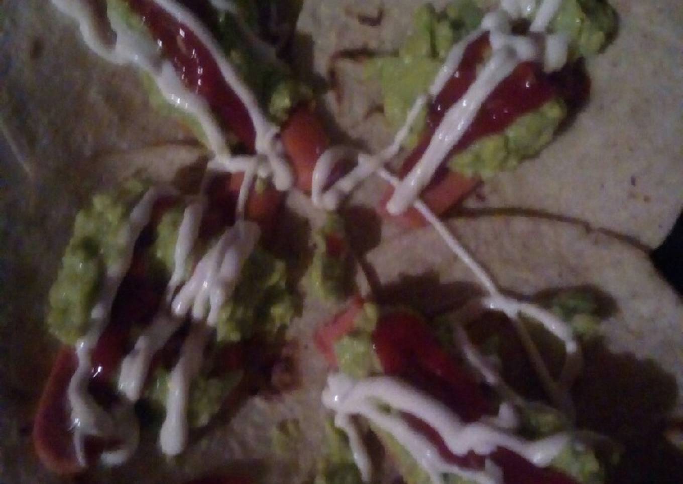 - Ahora la tortilla, de preferencia bien calientita. Toma las tortillas que desees, coloca en un plato y agrega la salchicha, el guacamol encima y luego rocía un poco de salsa ketchup y mayonesa a tu gusto dobla la tortilla.