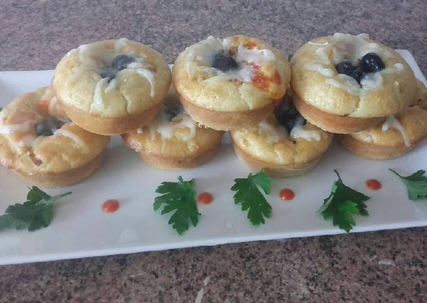 - Finalmente añadimos la mezcla de harina y levadura química y rellenamos nuestros moldes y ponemos encima un poco de salsa de tomate, atún, cebolla frita y lo decoramos con una aceituna y la horneamos