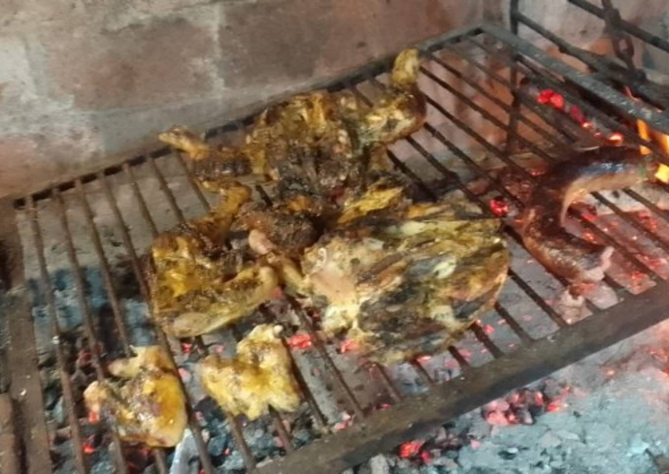 - Poner a la parrilla, con poca brasa para que se vaya haciendo despacio, para que quede dorado y jugoso a la vez, se pone del lado de los huesos, luego cuando está dorado, se da vuelta y se le pone trocitos de manteca, eso lo deja crocante y muy sabroso, y más limón