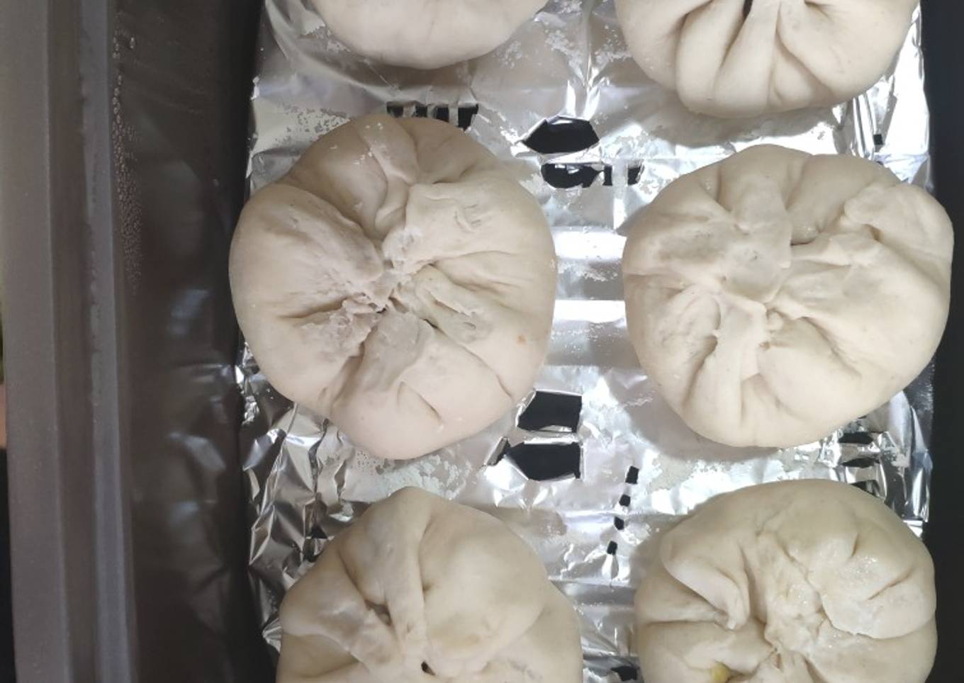 - Luego de tenerlos los bollitos listos, los ponemos en una vaporera por 30 min, sino tenemos vaporera, una idea es una olla honda con agua en el fondo al menos 2 a 3 dedos de alto un bowl pequeño dentro y encima un plato o rejilla, cuidado con quemarse. Nuestra vaporera tiene una rejilla a la cual le pusimos un aluminio con agujeros para que pudiera circular mejor el vapor!