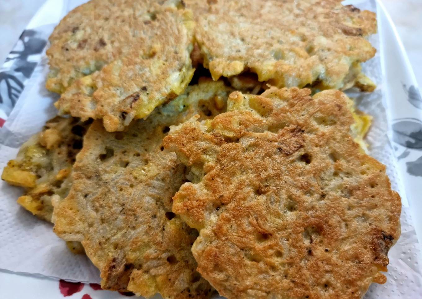 Si te sobraron papas fritas y arroz, puedes convertirlas en torrejas para tu almuerzo del día siguiente, así no desperdicias nada de comida, además que son súper fáciles de preparar.