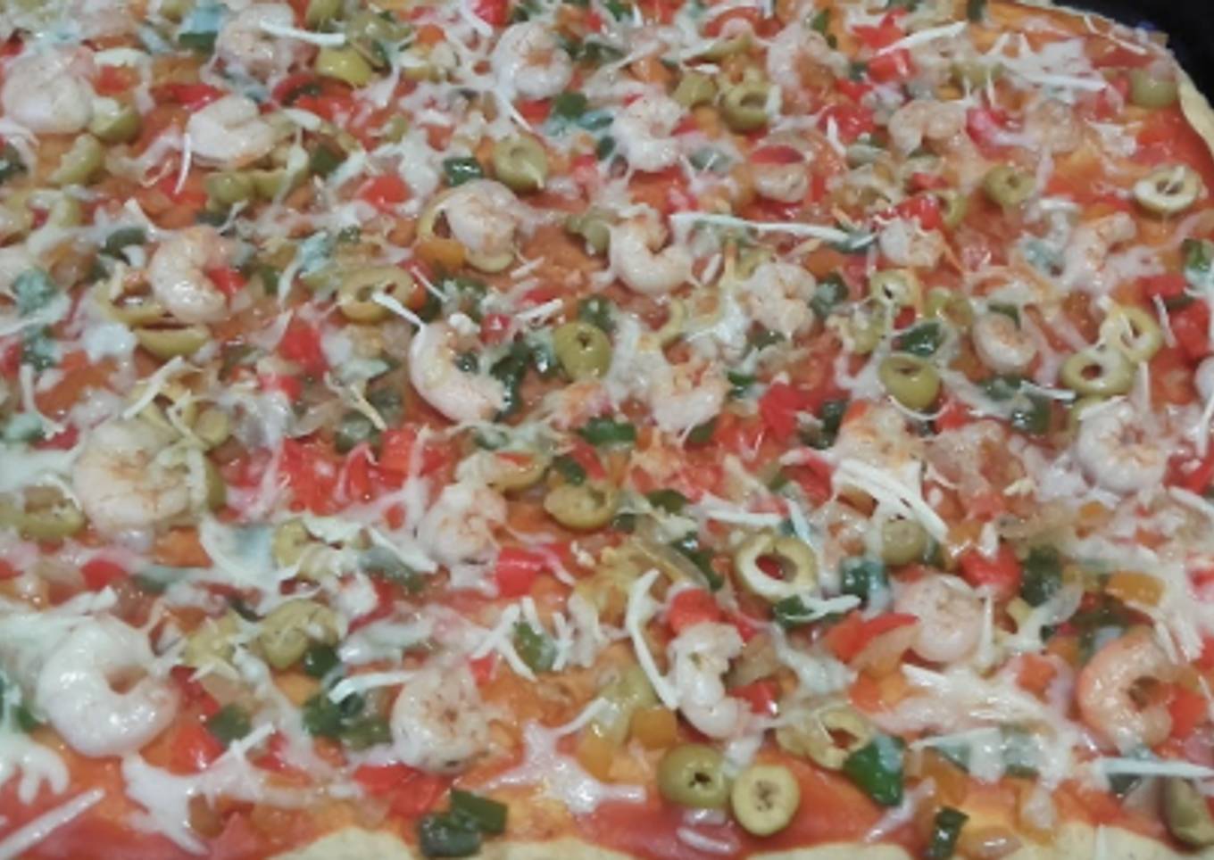 - Cuando la sacamos, la untamos con salsa de tomate, colocamos los pimientos, las aceitunas laminadas, las gambas y la cubrimos con queso rallado.