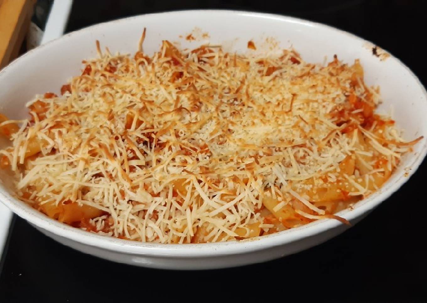- Escurrimos los macarrones y los echamos a la salsa. Removemos y ponemos todo en una fuente para horno. Lo cubrimos con queso rallado y lo ponemos a gratinar unos minutos (hasta que el queso se dore)