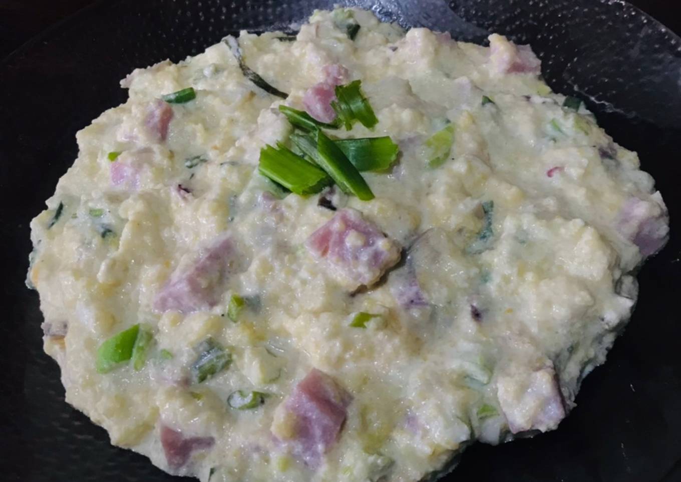 - En otro recipiente colocar el queso crema con la cucharada de leche, el verdeo picado, y el jamón cortado en trozos.
