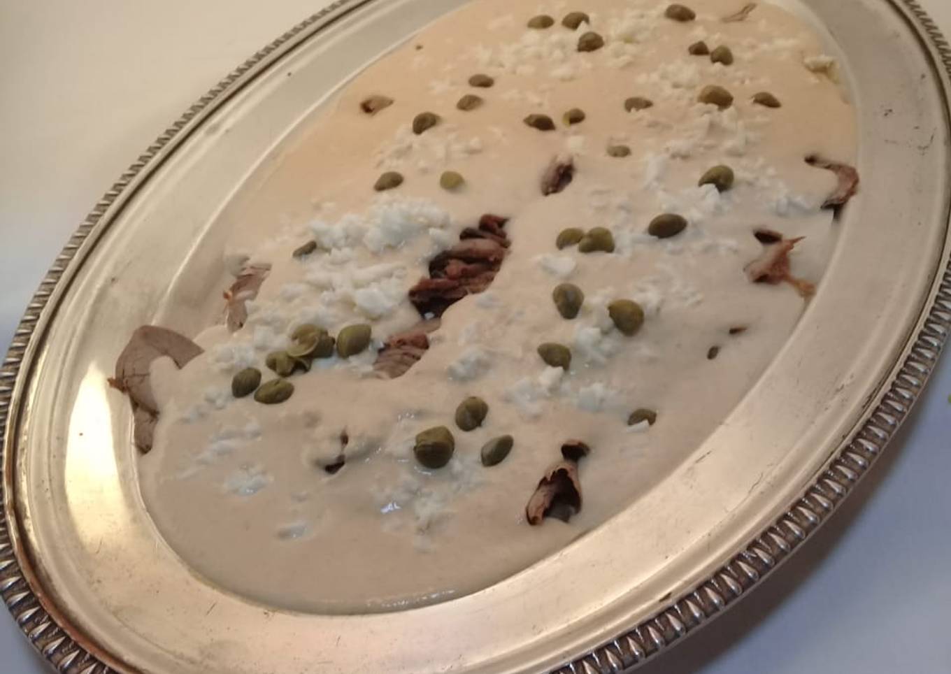 - Para la salsa poner en licuadora todos los ingredientes y licuar bien. Si hiciera falta echar un poco del jugo de la carne. Para el armado colocar las rodajas y por encima de modo que cubra todo echar la salsa y decorar con las alcaparras y el perejil. También se puede decorar con huevo duro.